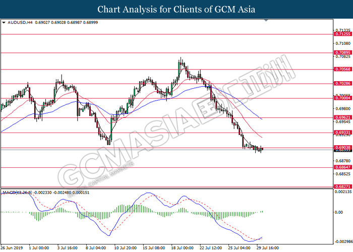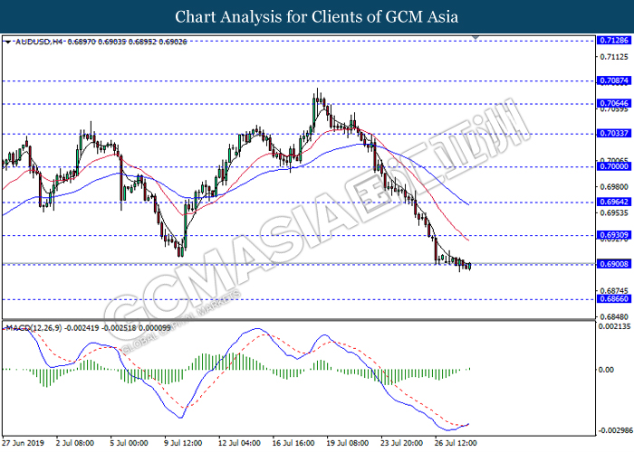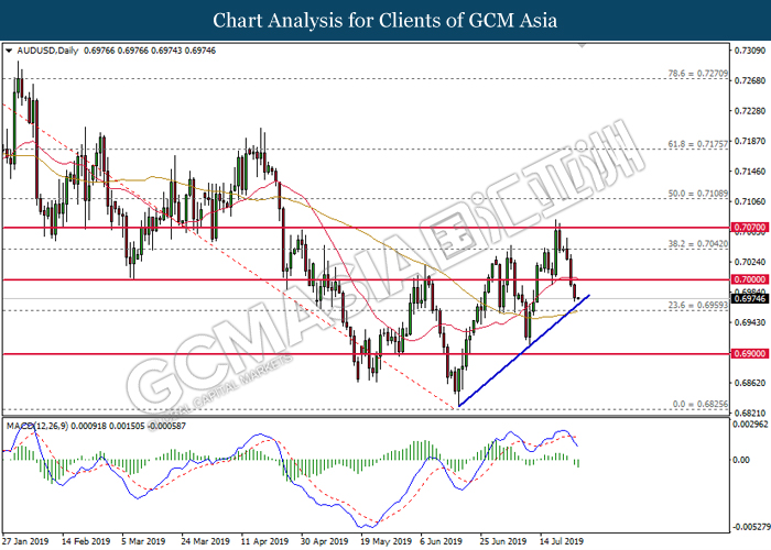 AUDUSD, H4: AUDUSD was traded lower while currently testing near the support level 0.6965. However, MACD which display diminishing bearish momentum suggest the pair to undergo a short term technical correction towards the resistance level 0.7000.