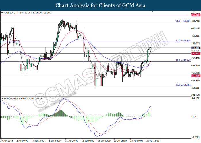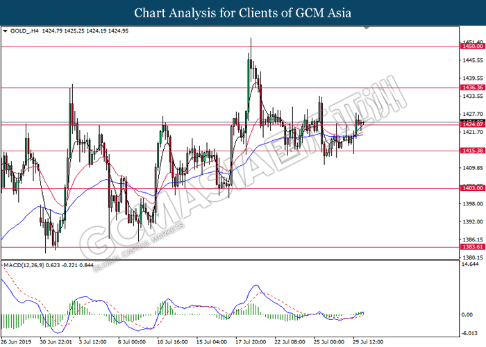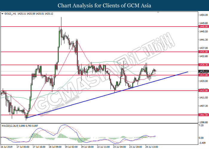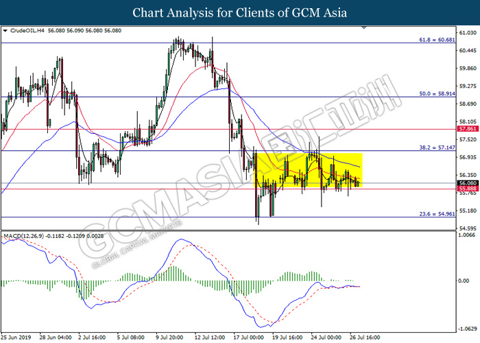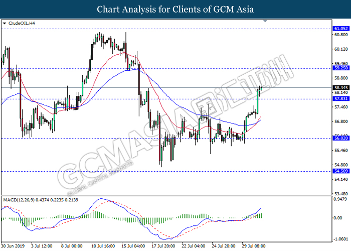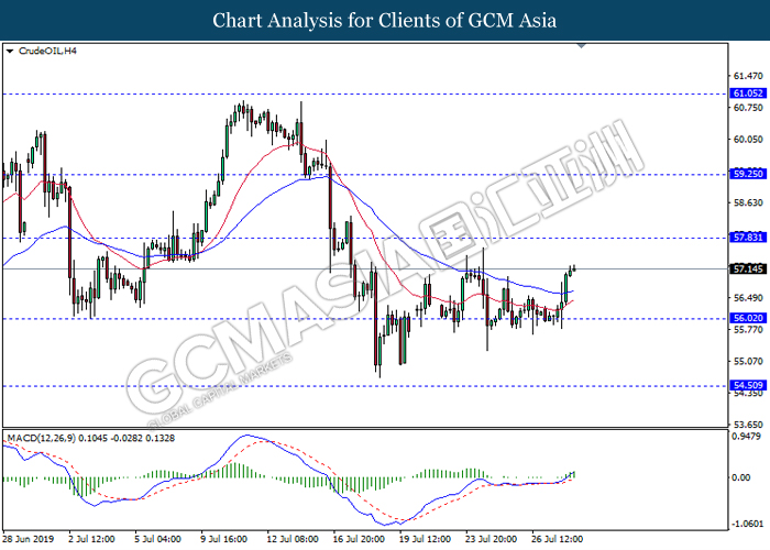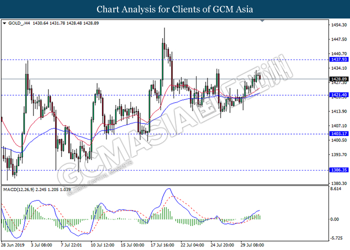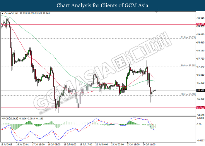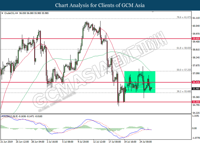 On the other hand, crude oil price further its rebound by 0.25% to $56.02 per barrel after recorded large losses despite a major fall in US crude inventories. Oil sentiment remains mixed amid tensions in the Middle East which are affecting global supply in the market while fear of global economy slowdown in the long run are affecting global demands. Oil traders are now waiting on possible developments in the Middle East to obtain clearer signals for oil’s movement. Likewise, gold price was falling by 0.25% to $1421.75 a troy ounce amid stronger dollar.