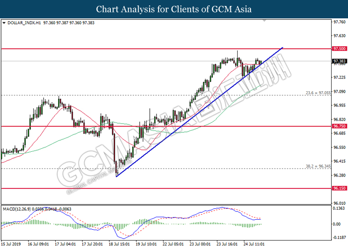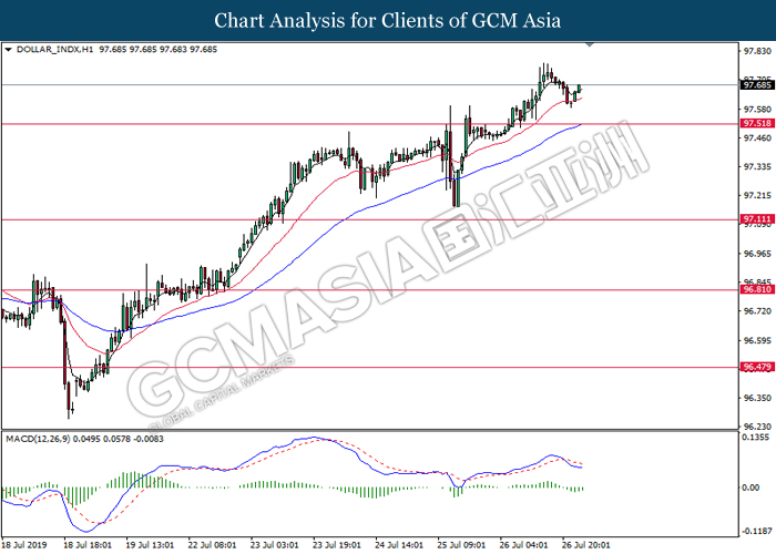 DOLLAR_INDX, H1: Dollar index was traded higher while currently testing the resistance of 97.50. MACD which illustrate bullish signal suggests the index to be traded higher after closing above 97.50.