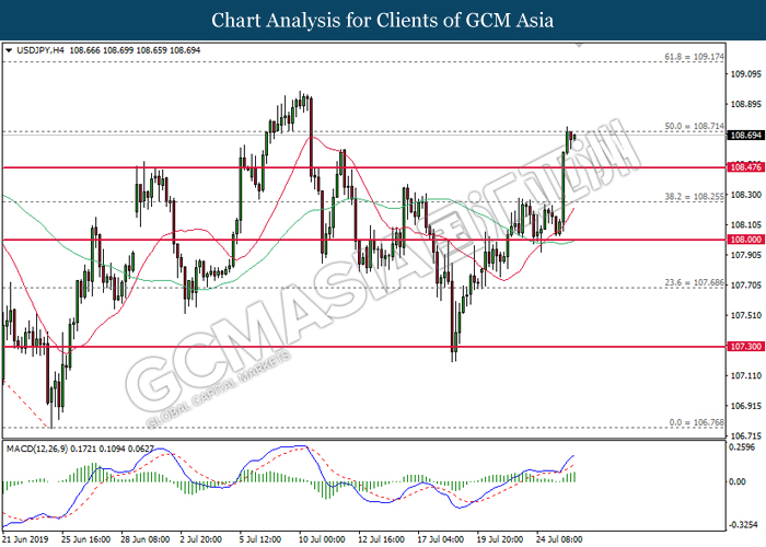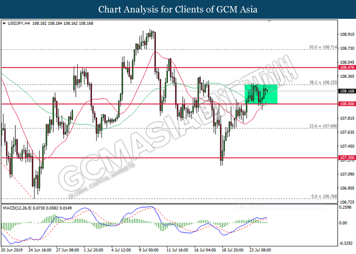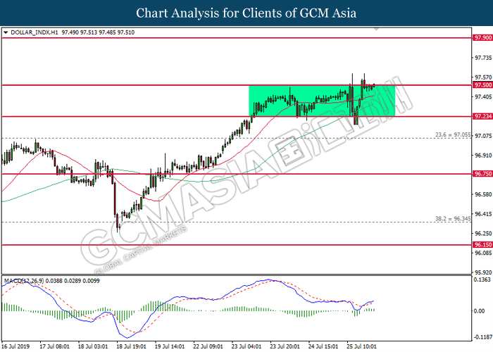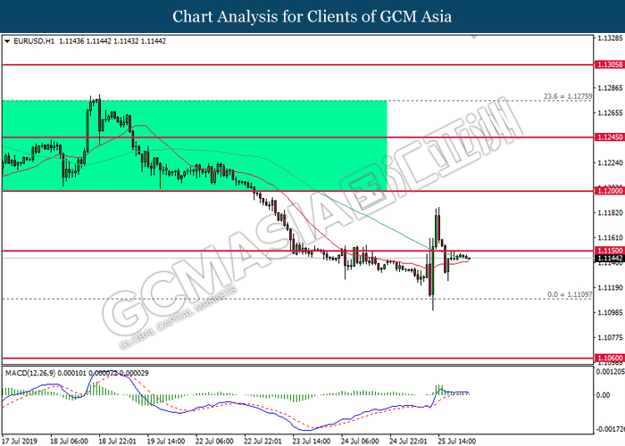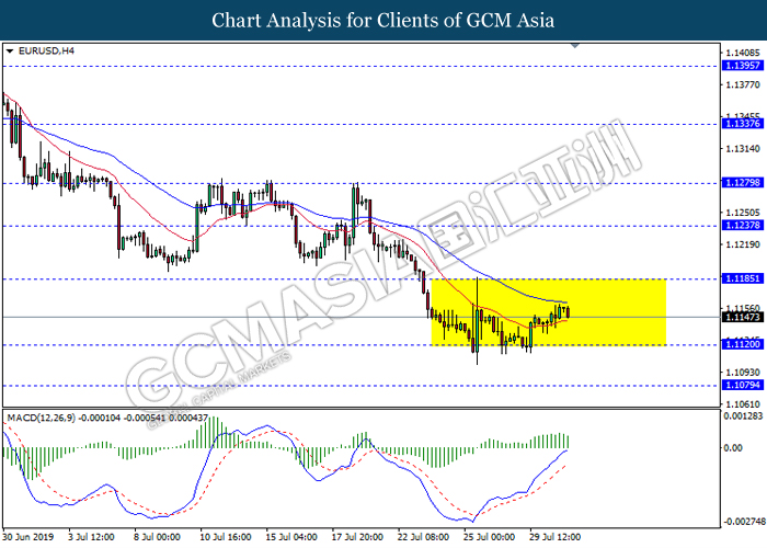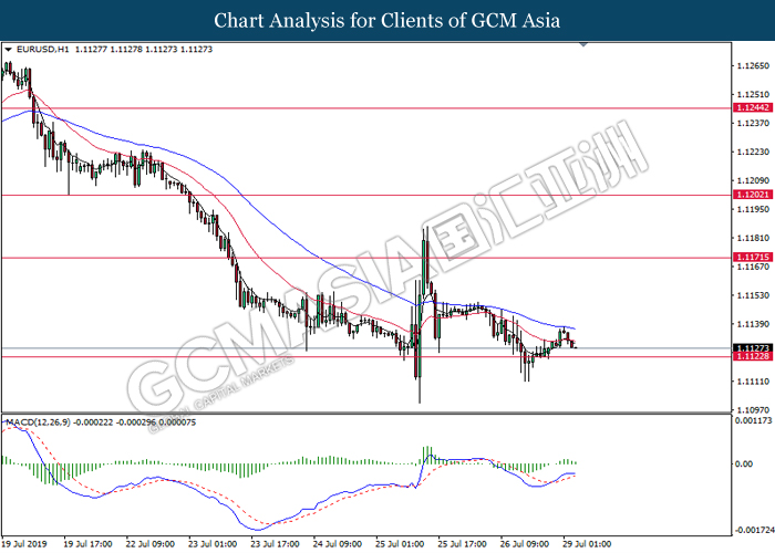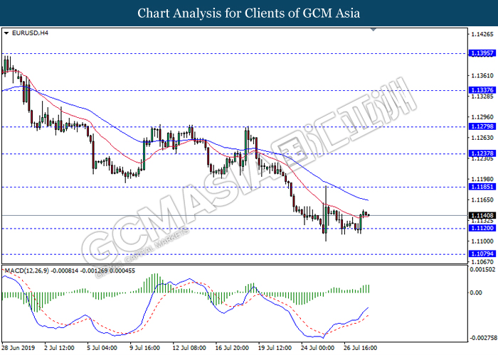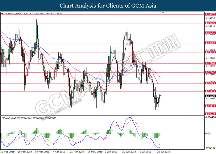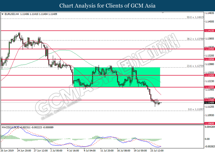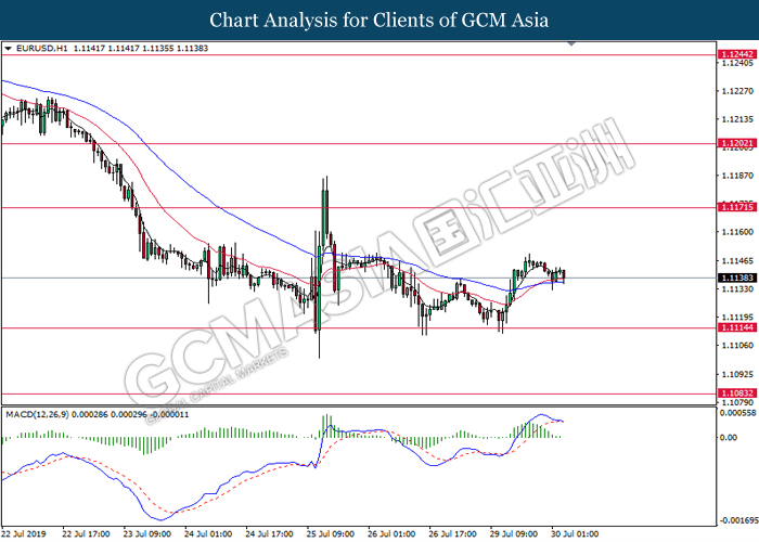Euro was traded with high volatility on yesterday post European Central Bank (ECB) interest rate decision which provided fairly dovish signals to the financial market. As widely expected by traders, ECB left their interest rate unchanged at 0.00%. In a statement released by the central bank, ECB comments that they would need to maintain a highly accommodative policy for a prolonged period of time and take into action if inflation outlook falls short of its expectation. However, Euro received some bearish pressure after ECB President Mario Draghi commented that the economic outlook is getting “worse and worse” due to ongoing trade war and possibility of a hard Brexit from the UK. He postulates that an economic rebound during the second half of the year is “less likely” but reiterates that the risks for a recession still remains low. Following his statements delivered during the press conference, market participants are currently speculating for an interest rate cut in September and possibility for an extensive bond purchasing program (QE). As of writing, pair of EUR/USD ticks up 0.02% to 1.1145. On the other hand, greenback rose 0.06% to 97.46 during Asian trading session. US dollar remains well supported after Core Durable Goods Orders and Initial Jobless Claims exceed economist expectation with 1.2% and 206K respectively.