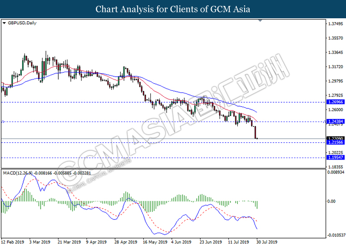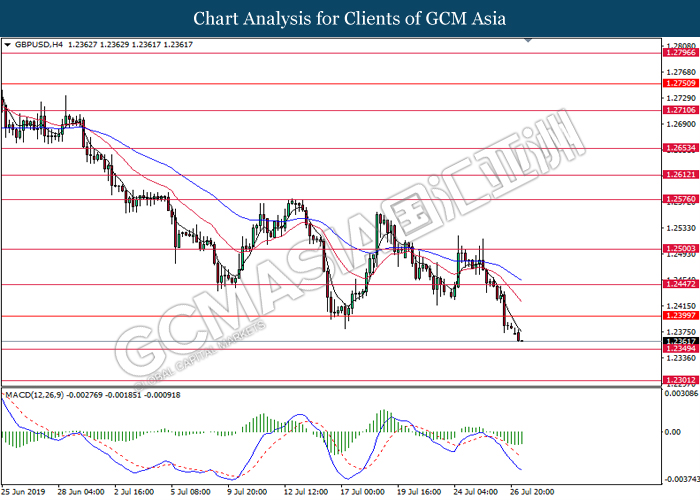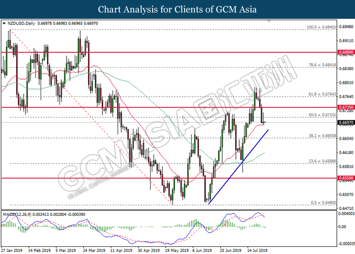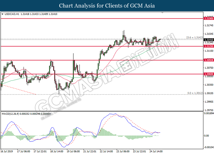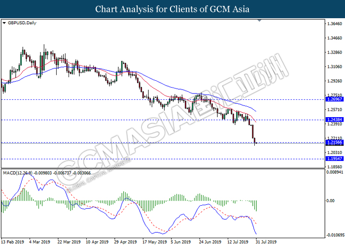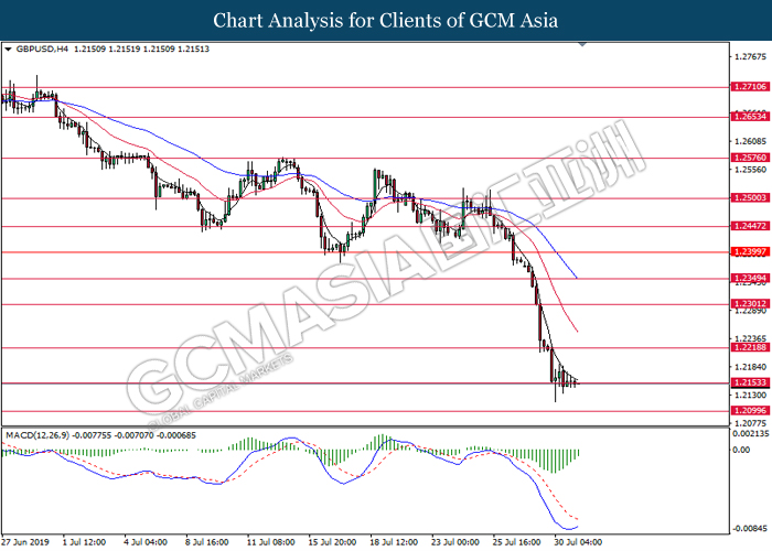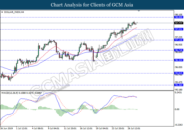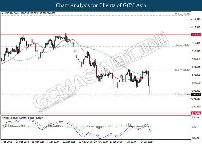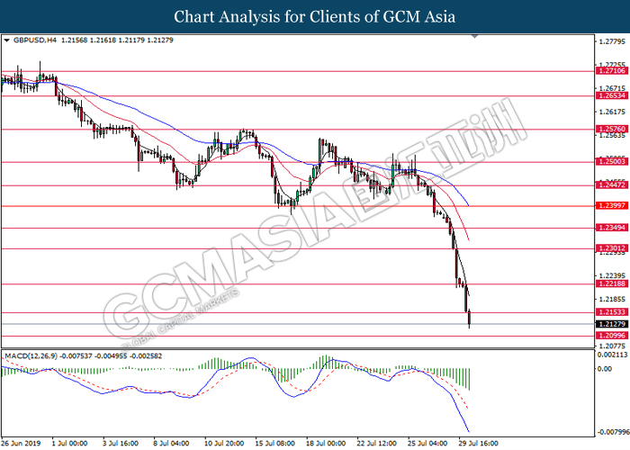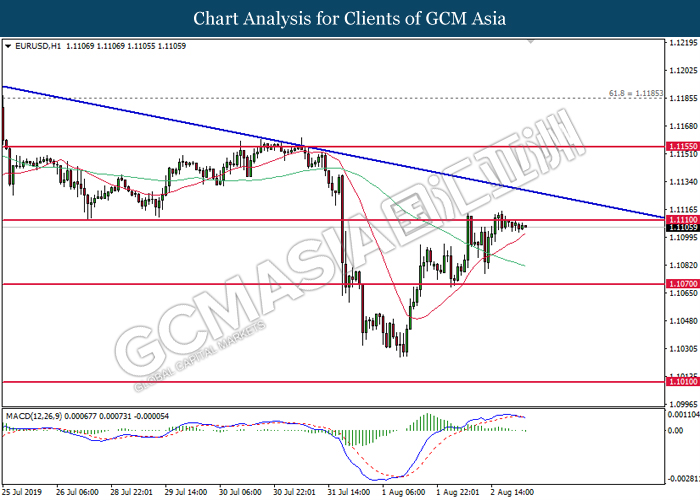 Euro was traded with high volatility on yesterday post European Central Bank (ECB) interest rate decision which provided fairly dovish signals to the financial market. As widely expected by traders, ECB left their interest rate unchanged at 0.00%. In a statement released by the central bank, ECB comments that they would need to maintain a highly accommodative policy for a prolonged period of time and take into action if inflation outlook falls short of its expectation. However, Euro received some bearish pressure after ECB President Mario Draghi commented that the economic outlook is getting “worse and worse” due to ongoing trade war and possibility of a hard Brexit from the UK. He postulates that an economic rebound during the second half of the year is “less likely” but reiterates that the risks for a recession still remains low. Following his statements delivered during the press conference, market participants are currently speculating for an interest rate cut in September and possibility for an extensive bond purchasing program (QE). As of writing, pair of EUR/USD ticks up 0.02% to 1.1145. On the other hand, greenback rose 0.06% to 97.46 during Asian trading session. US dollar remains well supported after Core Durable Goods Orders and Initial Jobless Claims exceed economist expectation with 1.2% and 206K respectively.
