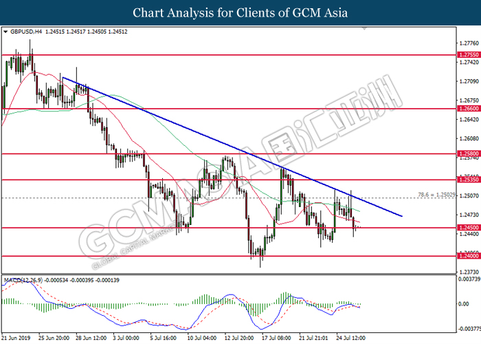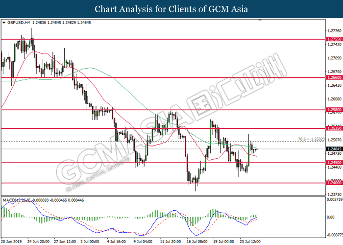 GBPUSD, H4: GBPUSD was traded lower following prior retrace from 1.2500. MACD which illustrate diminished upward momentum suggests the pair to be traded lower in short-term after closing below the 20-MA line (red).