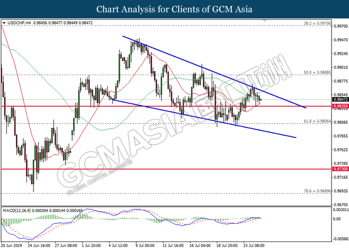 USDCHF, H4: USDCHF was traded lower following prior retracement from the upper level of descending wedge. MACD which illustrate diminished upward momentum suggests the pair to be traded lower in short-term after breaking 0.9835.