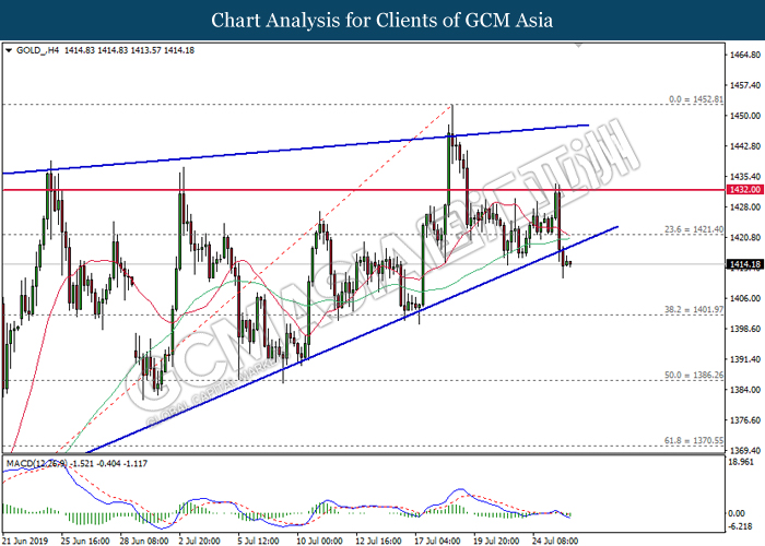 GOLD_, H4: Gold price was traded lower after breaking out from the bottom level of ascending wedge. MACD which illustrate bearish signal suggests its price to advance further down, towards the direction of 1402.00.