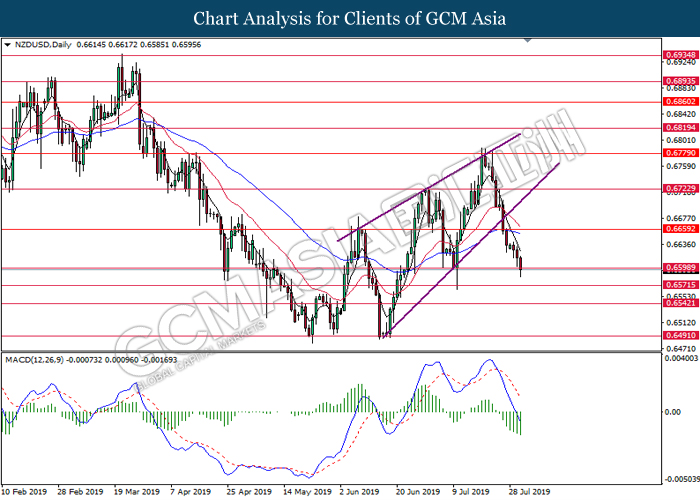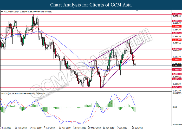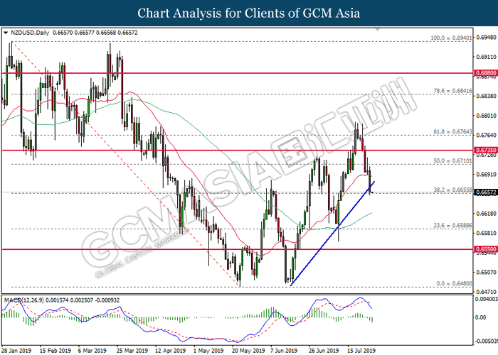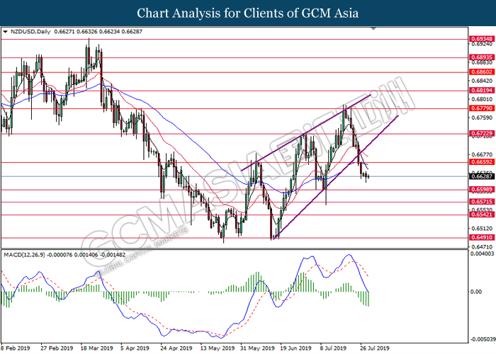 NZDUSD, Daily: NZDUSD was traded lower after breaking the upward trendline. MACD which has formed a bearish signal suggests the pair to extend its losses after breaking the support of 0.6655.