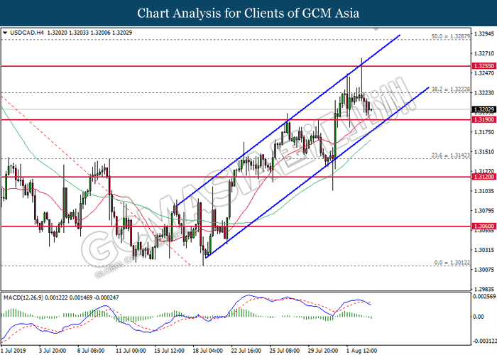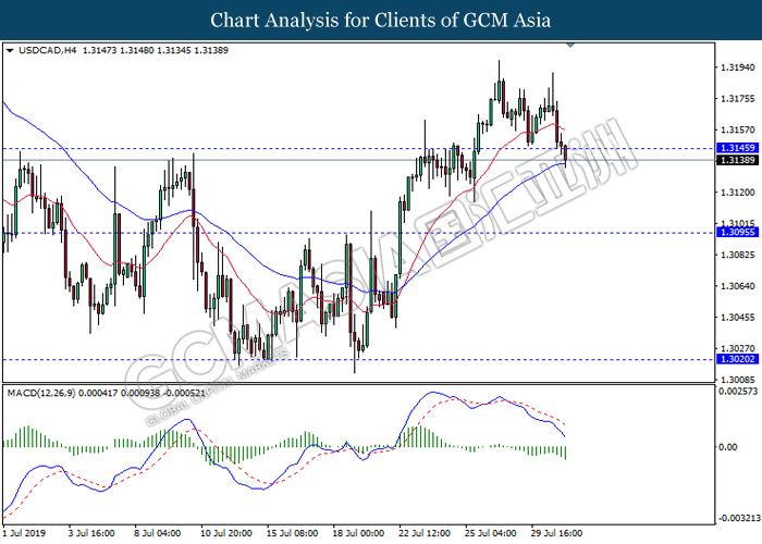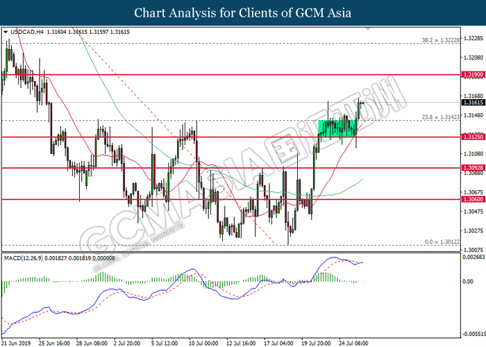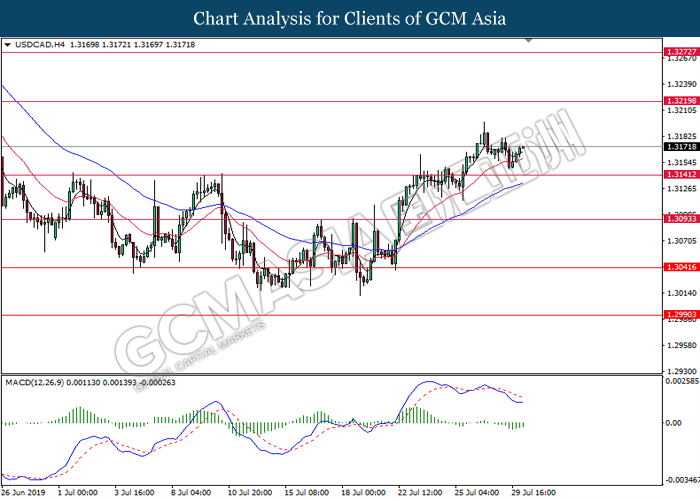 USDCAD, H4: USDCAD was traded higher following prior rebound from the support of 1.3125. MACD which begins to form a bullish signal suggests the pair to advance further up, towards the direction of 1.3190.