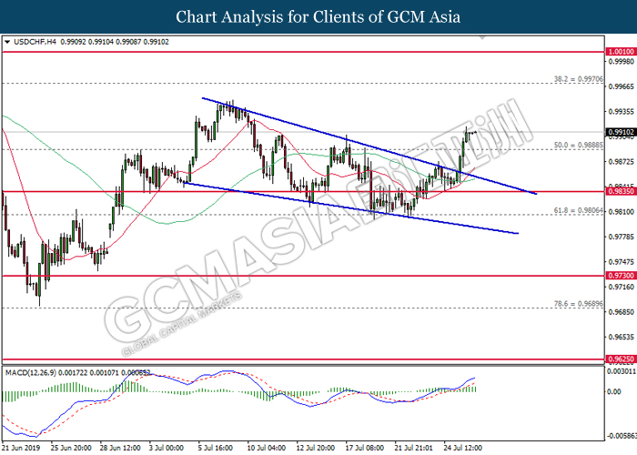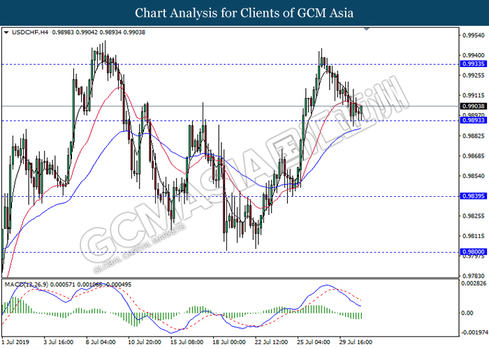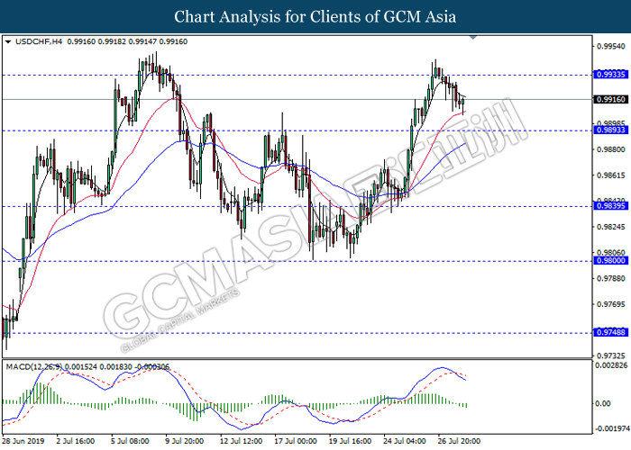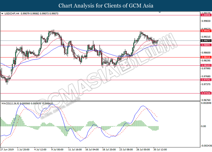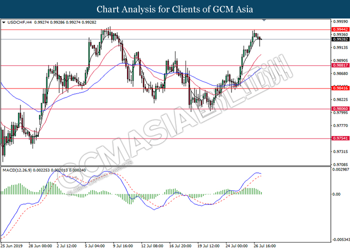 USDCHF, H1: USDCHF was traded higher while currently testing the resistance level 0.9905. However, MACD which display bearish momentum with the formation of death cross suggest the pair to undergo short-term technical correction and retrace towards the support level 0.9860.