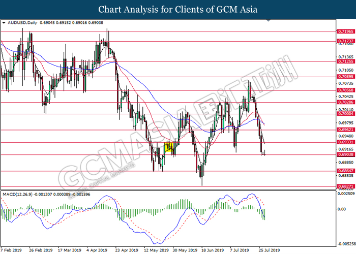 AUDUSD, Daily: AUDUSD was traded lower after breaking the upward trendline. MACD which illustrate persistent bearish signal suggests the pair to extend its losses towards the direction of 0.6900.