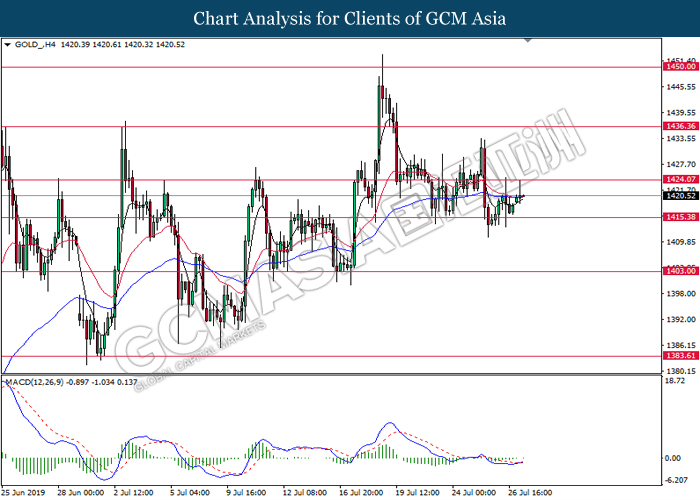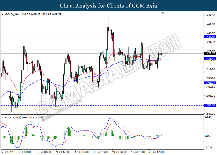 GOLD_, H4: Gold price was traded flat near the support level 1421.40. Due to lack of momentum and direction from MACD, it is suggested to wait until further clear signal appear before entering the market.