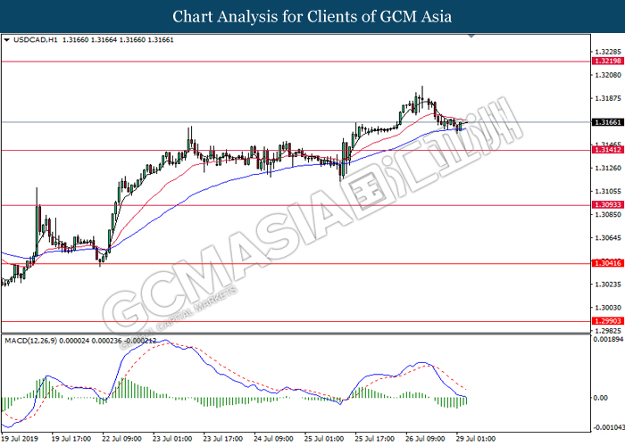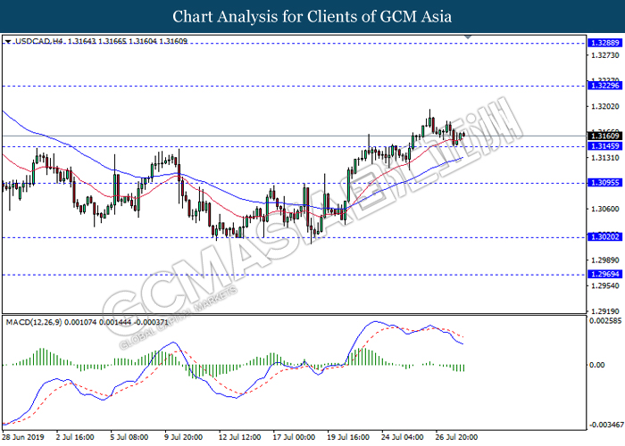 USDCAD, H4: USDCAD was traded higher while currently testing the resistance level 1.3160. MACD which display bullish bias signal suggest the pair to extend its gains after successfully breaking above the resistance level.