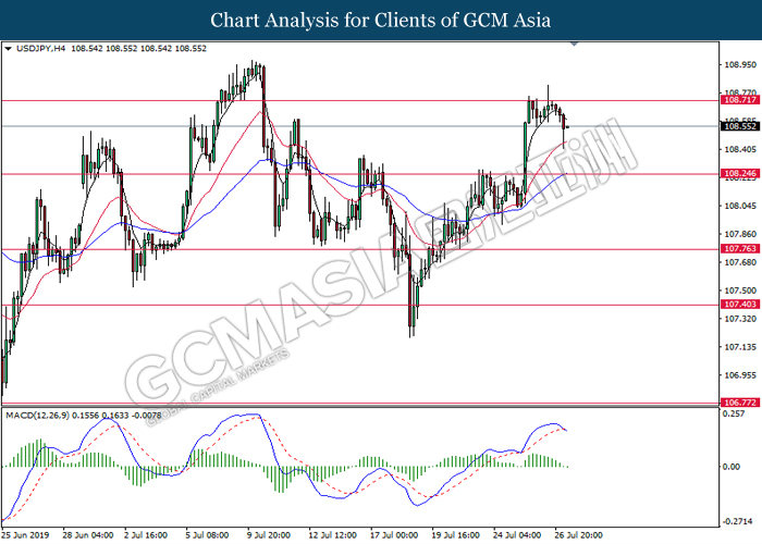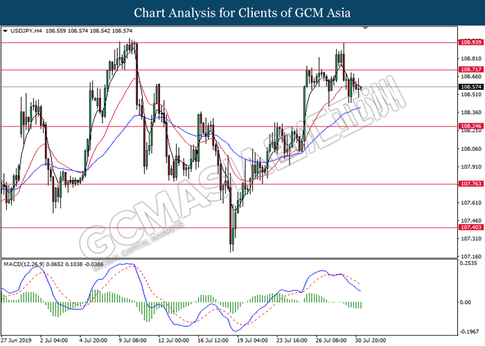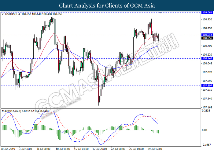 USDJPY, H4: USDJPY was traded lower following prior retracement from 108.25. MACD which illustrate diminishing upward momentum suggests the pair to be traded lower in short-term towards the direction of 108.00.