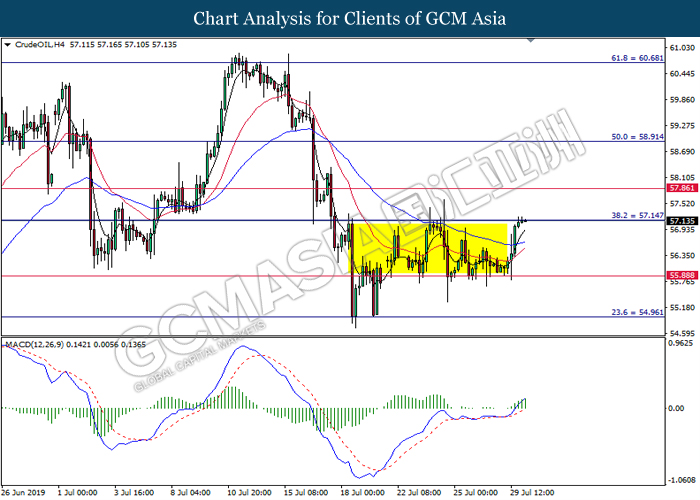 CrudeOIL, H1: Crude oil price was traded higher following prior rebound from the support of 55.70. MACD which illustrate diminishing downward momentum suggests its price to be traded higher in short-term.