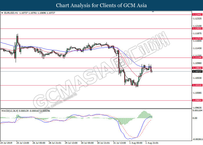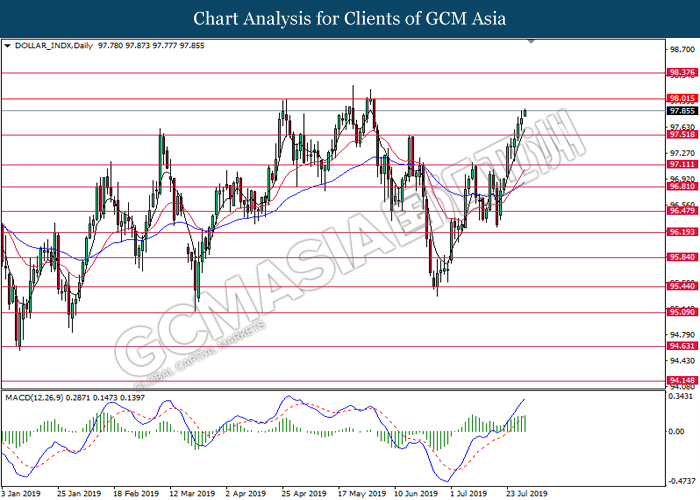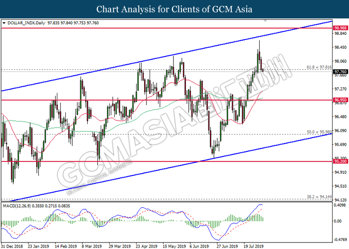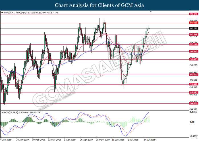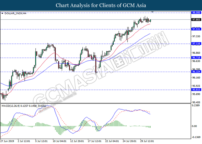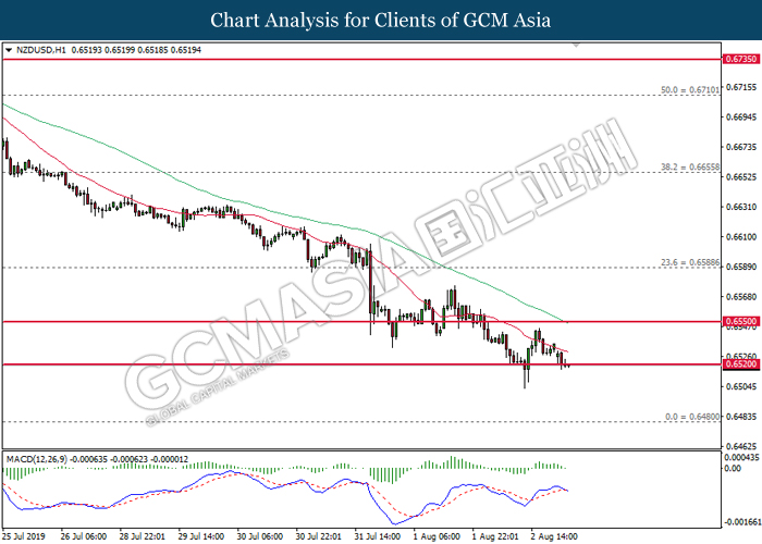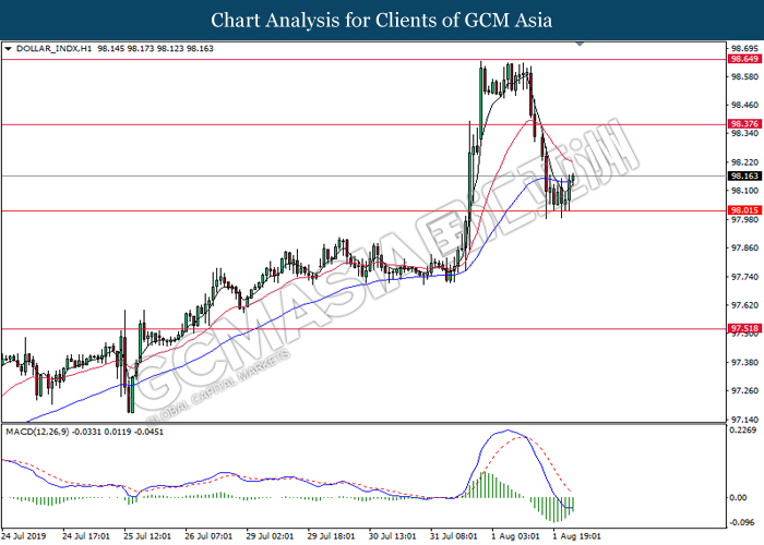 US dollar extended its losses although recent jobs report shows within expectation reading for last month. According to US Bureau of Labor Statistics, Nonfarm Payrolls for the month of July came in at 164,000, well within economist forecast. On the other hand, Average Hourly Earnings tick up by 0.1% to 0.3% for last month while unemployment rate remains steady at 50-years low of 3.7%. However, greenback failed to garner any substantial bullish momentum as the Nonfarm Payrolls data for the past few months portrays diminishing hiring momentum. Likewise, the data also failed to ease market speculation for an interest rate cut next month as it is currently priced in with a 98.5% as of writing. In addition, demand for risky assets in the market remains tepid following escalating trade tension in between US and China after Washington threatened to impose another 10% tariff starting 1st September. Following the announcement, traders shifted their portfolio from risky assets into safe-havens such as Japanese yen or Swiss Franc. For the time being, investors will continue to monitor economic developments in the US as well as current trade tensions in order to attain more market signals. During Asian trading session, the dollar index ticked down 0.01% to 97.80.