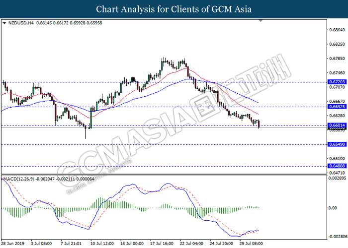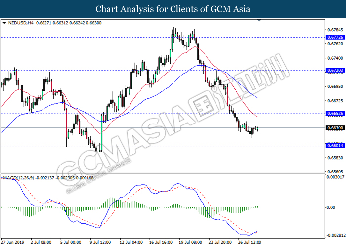 NZDUSD, H4: NZDUSD was traded lower following prior retracement from the resistance level 0.6720. MACD which illustrate bearish momentum suggest the pair to extend its losses towards the support level 0.6650.