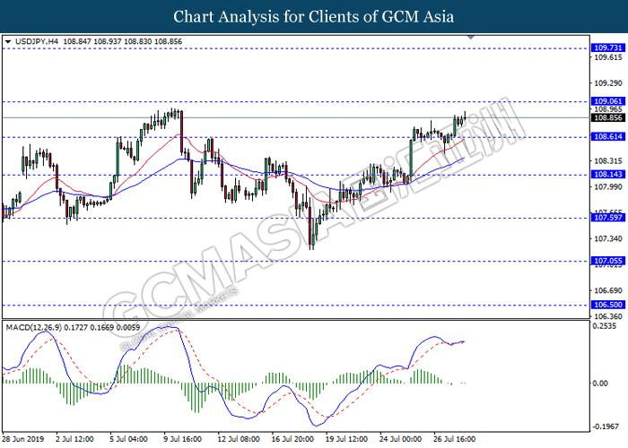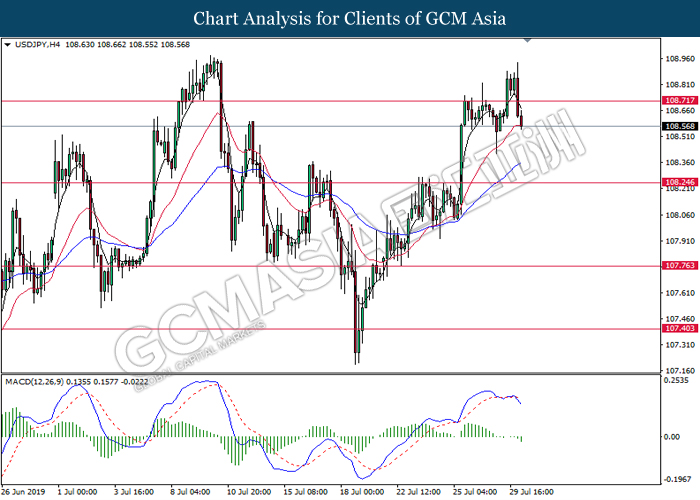 USDJPY, H4: USDJPY was traded higher while currently testing the resistance of 108.70. MACD which illustrate bullish signal suggest the pair to extend its gains after closing above 108.70.