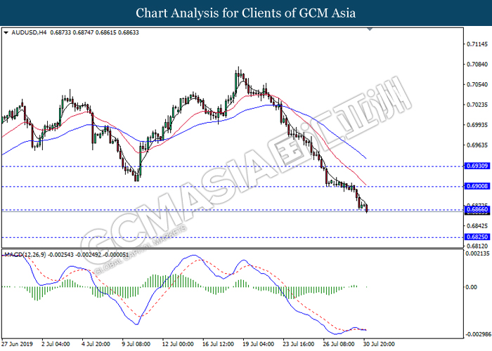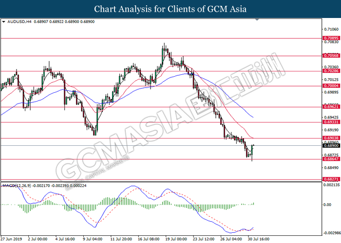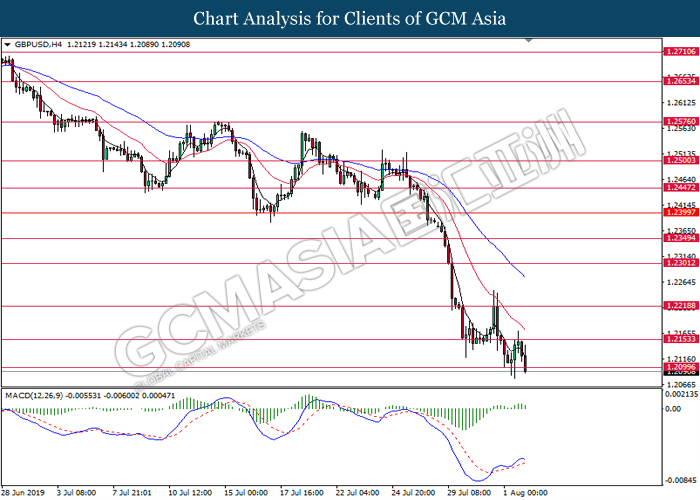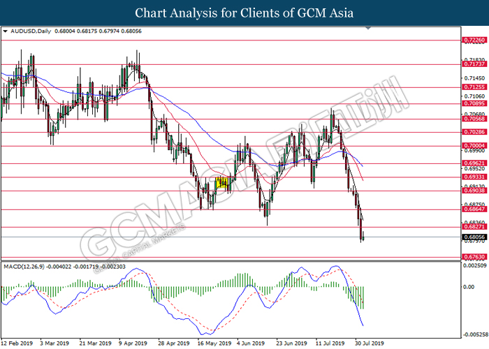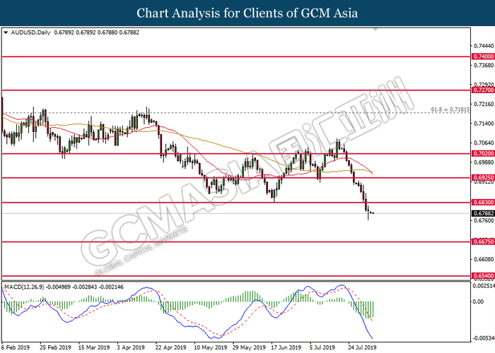 Australian dollar extended its losses although latest economic data portrays stronger consumer spending in the region. According to Australian Bureau of Statistics, Retail Sales for the month of June came in at 0.4%, slightly higher than forecasted reading of 0.3%. However, Australian dollar failed to garner any bullish support after US President Donald Trump announced to impose another 10% tariff upon $300 billion worth of Chinese goods starting on 1st September. The announcement has deteriorated market optimism towards China which is one of the largest trade partners for Australia. A possible economic risk from the announcement of tariff ripples through the market, driving investors portfolio from risky assets into safe-havens such as Japanese yen and gold. For the time being, investors will continue to monitor further developments with regards to trade negotiation in between US and China in order to attain more market signals. On the other hand, pound sterling continues to extend its losses as speculation over a hard Brexit continue to gain its traction. With Brexit deadline approaches, many analyst postulates that UK PM Boris Johnson is running out of time to re-negotiate its Brexit terms with the EU, sparking higher chances for an exit without any substantial deal. As of writing, pair of AUD/USD was quoted down 0.03% to 0.6807 while GBP/USD extended its losses by 0.32% to 1.2094.