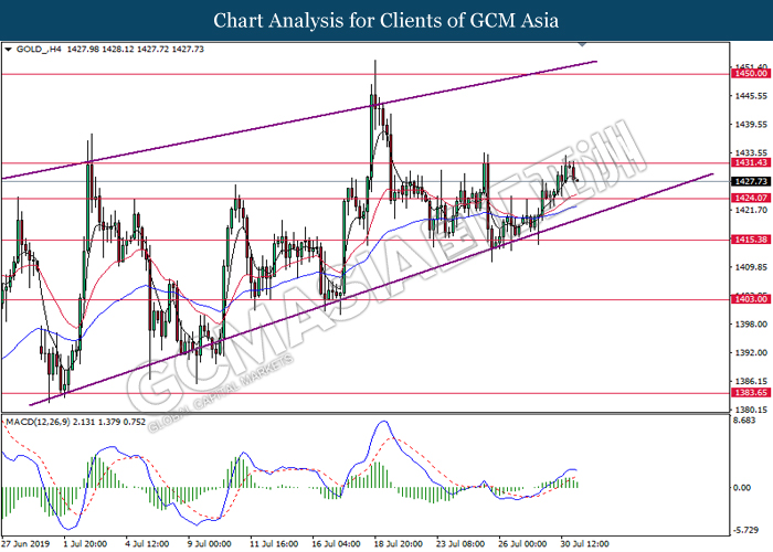 On the other hand, crude oil price recovered its losses by 0.11% to $55.83 per barrel. According to Energy Information Administration, US crude stockpiles fell by -10.835 million barrels last week, a higher drop when compared to forecast of only -4.011 million barrels. However, oil prices failed to gain bullish momentum from the report after several analyst concluded that the massive draw in oil inventories may be distorted by the production shutdown during Hurricane Barry. As for gold, price of the yellow metal rose 0.02% to $1,425.84 a troy ounce as major central banks around the globe begins to adopt monetary policy easing.