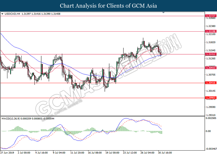 USDCAD, H4: USDCAD was traded lower following prior retracement from the resistance level 1.3145. MACD which display starting bearish momentum with the formation of death cross suggest the pair to extend its retracement towards the support level 1.3095.