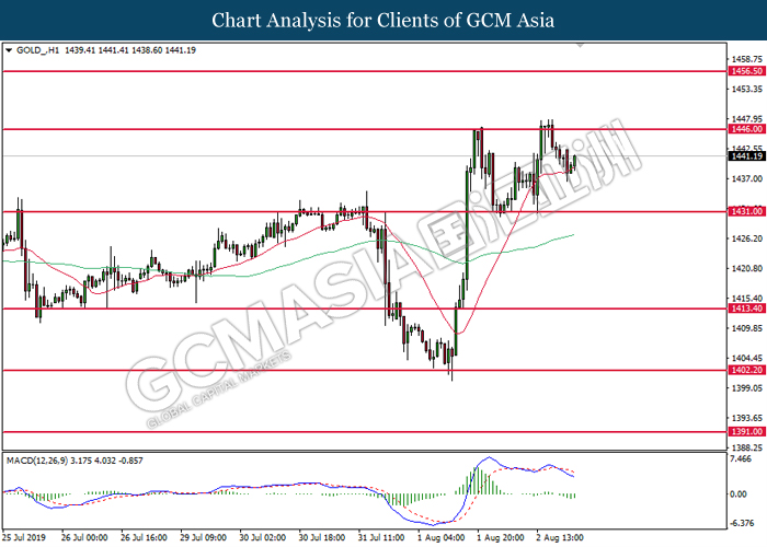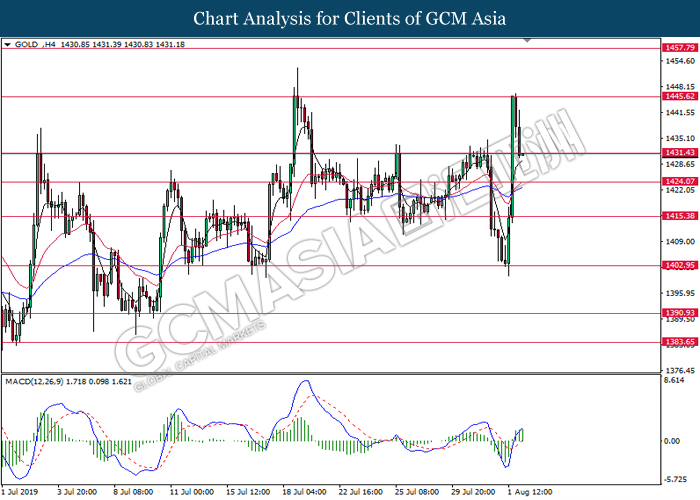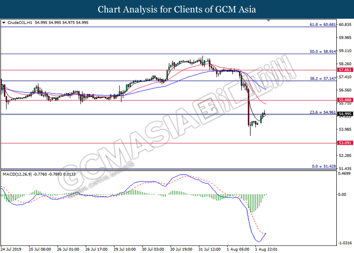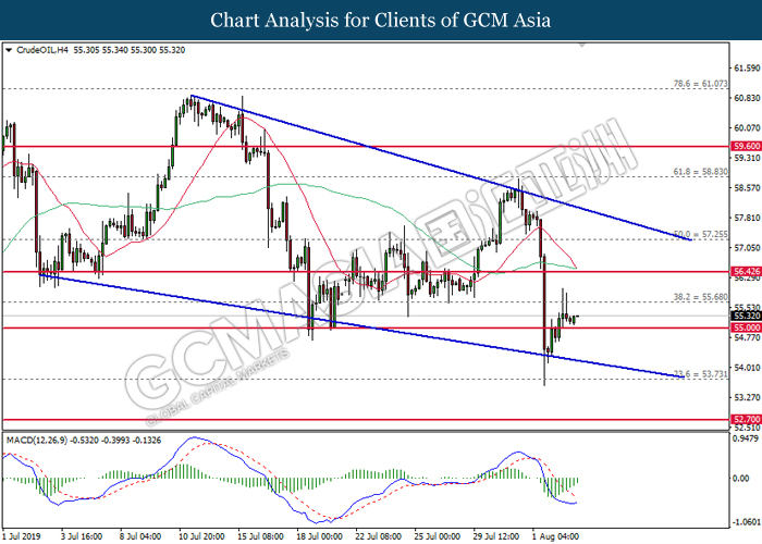 In the commodities market, crude oil price recovered its losses by 1.03% to $54.95 per barrel. Oil prices rebounds from its prior low levels following a large slump on yesterday after Trump announced additional tariffs upon China. Tariffs may jeopardize trade activities in between US and China that may spark higher chances for recessive risk and thus reducing long-term demand for crude oil. On the other hand, gold price slumped 0.91% to $1,431.19 a troy ounce as traders ended their profiting positions from yesterday’s appreciation in its price.