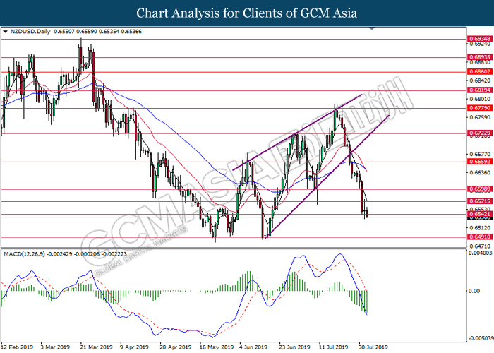 NZDUSD, H4: NZDUSD was traded lower following prior retracement from the resistance level 0.6540. Due to lack of momentum and signal from MACD, a breakout above or below the resistance and support level is required to obtain further confirmation before entering the market.