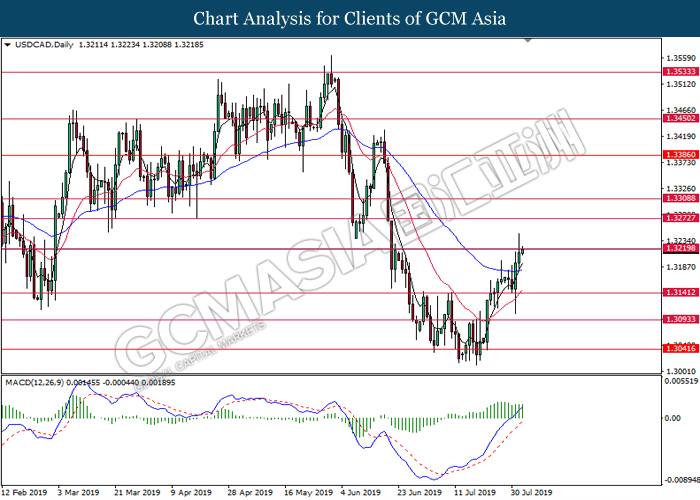 USDCAD, H4: USDCAD was traded higher while currently testing near the resistance level 1.3240. MACD which display bullish bias signal suggest the pair to extend its gains after successfully breaking above the resistance level.