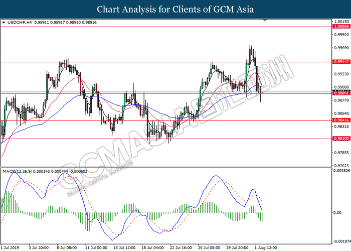 USDCHF, H4: USDCHF was traded lower while currently testing near the support level 0.9840. MACD which illustrate bearish bias signal with the starting formation of death cross suggest the pair to extend its losses after it breaks below the support level.