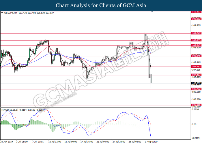 USDJPY, Daily: USDJPY was traded lower while currently testing at the support of 106.50. MACD which illustrate bearish signal suggests the pair to extend its losses after closing below 106.50.