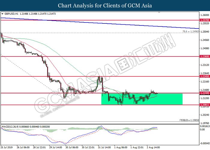 GBPUSD, H1: GBPUSD remains traded within a sideways channel while currently testing at the top level. MACD which illustrate bullish signal suggest the pair to extend its gains after closing above 1.2150.