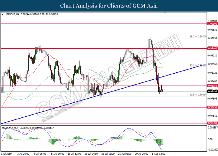 USDCHF, H4: USDCHF was traded lower after retracing from the resistance of 0.9835. MACD which illustrate bearish signal suggests the pair to extend its losses, towards the direction of 0.9805.