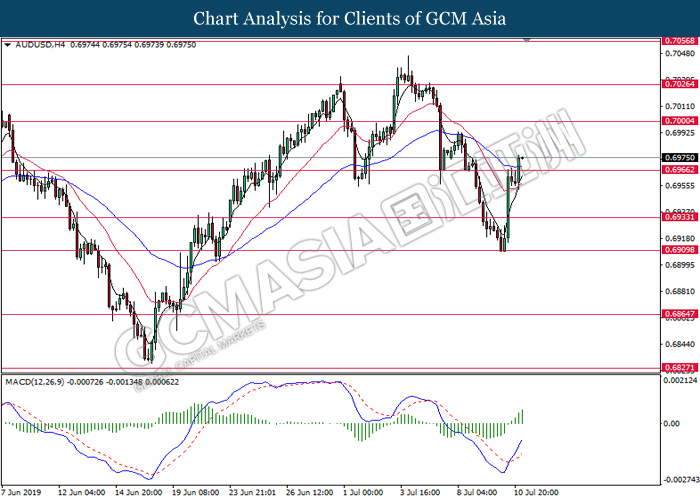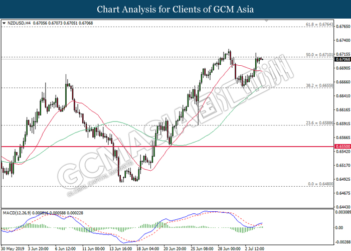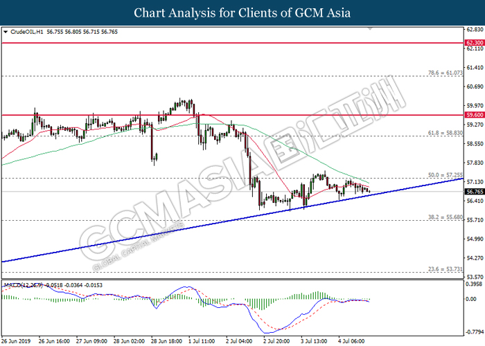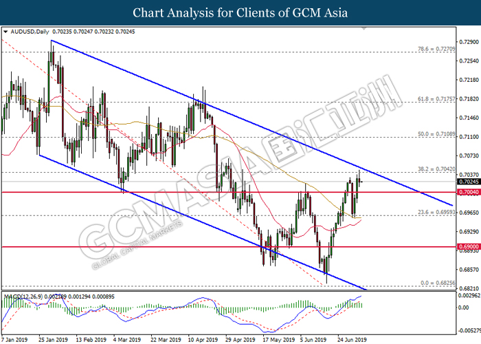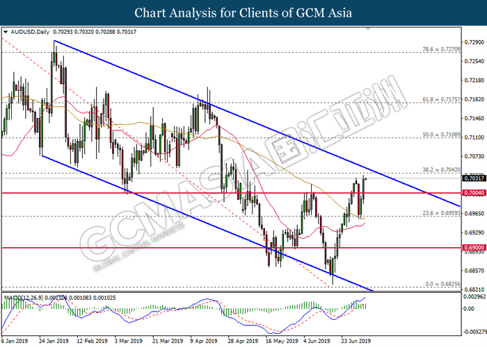 Dollar index which measuring against a basket of six major currency pairs have fell 0.10% to 96.18 at the time of writing as greenback sellers remain dominant on the greenback weakness. Recent weak data where ADP shows lower-than-expected jobs generation in the private sector continues to fuel the sell-off upon US dollar. Besides that, falling Treasury yields boosted expectations the U.S. Federal Reserve will cut their interest rates later this month for the first time in a decade where as it inches towards the lowest level in more than 2-1/2 years. Market participants will now focus upon U.S non-farm payrolls for further signals with regards to the direction of the greenback. Meanwhile, AUD/USD gains 0.21% to 0.7040 as of writing despite downbeat retail sales data. According to Australian Bureau of Statistic, retail sales in Australia have slipped 0.1% which missed market expectation with the reading of 0.2%. However, bullish bets upon the Aussie dollar remain resilient after recent report shows that the Australian government is close to secure a major tax cut plan which may further support their economy.