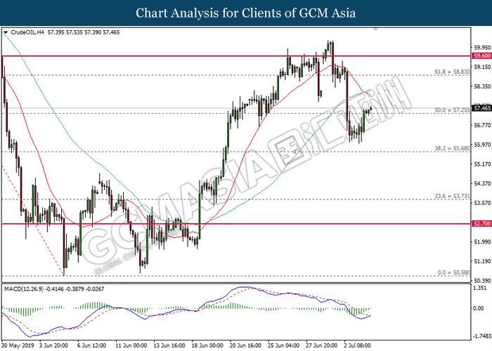 CrudeOIL, H4: Crude oil price was traded lower following prior retracement from the 60-MA line (red). MACD which illustrate persistent bearish momentum suggest the commodity to extend its losses towards the support level 55.85.