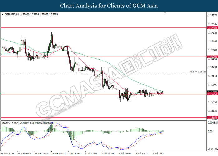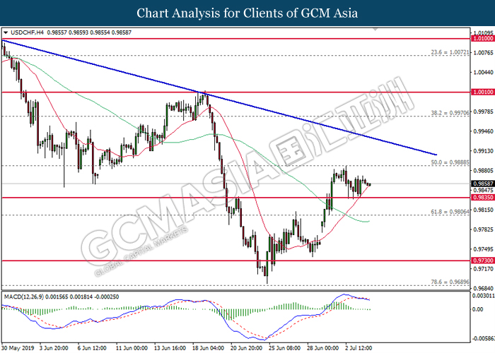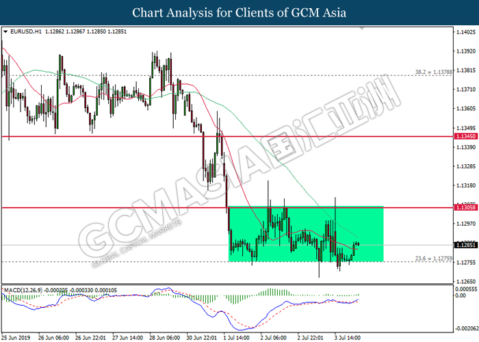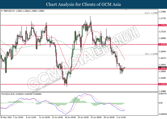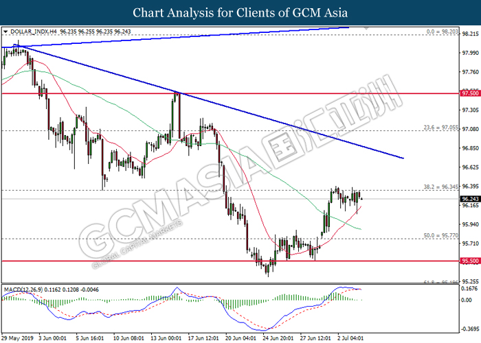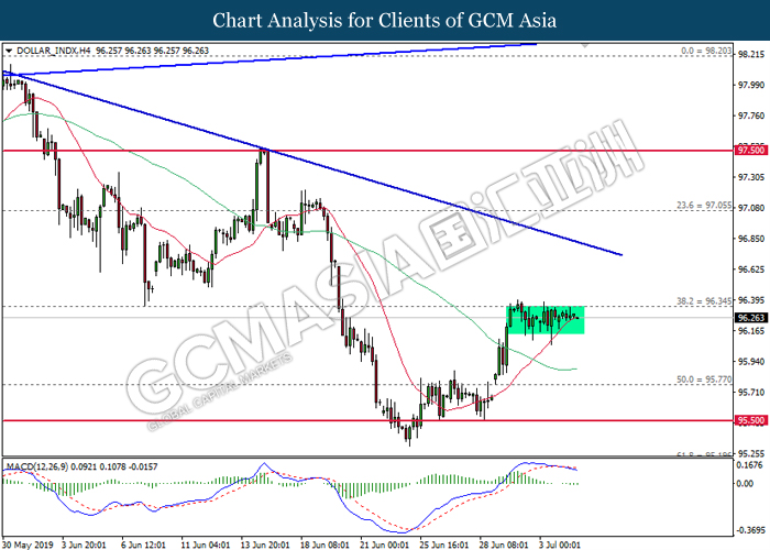 US dollar remains traded within a tight range following the release of bearish economic data from the region. According to ADP, Nonfarm Employment Change for the month of June came in at 102K, missing economist forecast for a reading up to 140K. In addition, Institute for Supply Management reported that its Non-Manufacturing PMI experienced slight contraction to 55.1 from 56.9 for the month of June. Both data has further cemented the course for an interest rate cut from the Federal Reserve at the end of the month. However, market reaction towards both data was rather limited as US market will be closed for trading today in conjunction with Independence Day. On the other hand, pound sterling was settled lower on yesterday due to lesser-than-expected activity reading for its Services sector. According to Markit, UK’s Services PMI for the month of June came in slightly lower at 50.2, missing economist forecast to remain stable at 51.0. The data was released a day after Bank of England Governor Mark Carney signaled to make adjustments upon its monetary policy in order to support Britain’s growth due to ongoing trade risks in the global market. As of writing, the dollar index ticks up 0.02% to 96.27 while pair of GBP/USD recovered its losses by 0.08% to 1.2580.