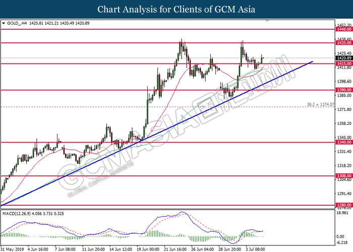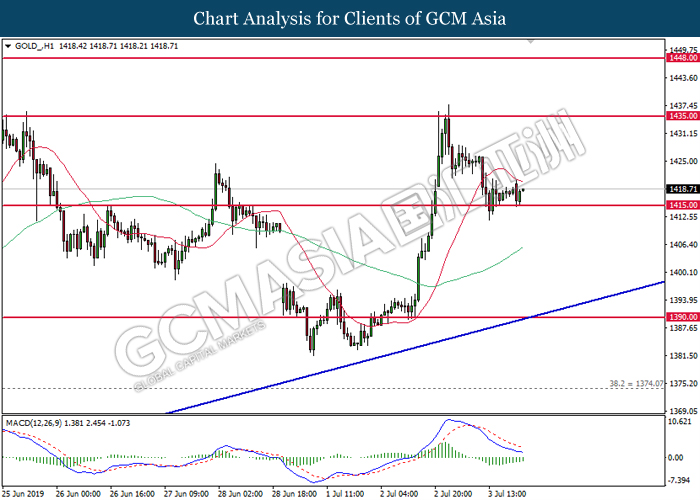 GOLD_, H1: Gold price was traded higher following prior rebound from the support of 1415.00. MACD which illustrate diminishing downward momentum suggests its price to extend further up after closing above the 20-MA line (red).