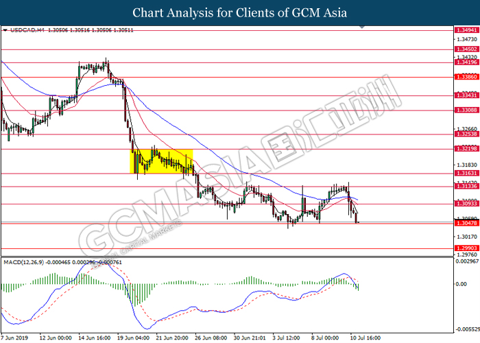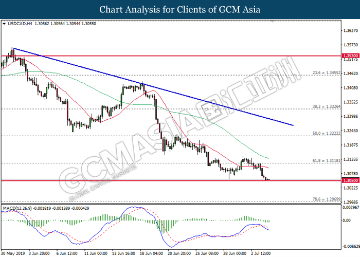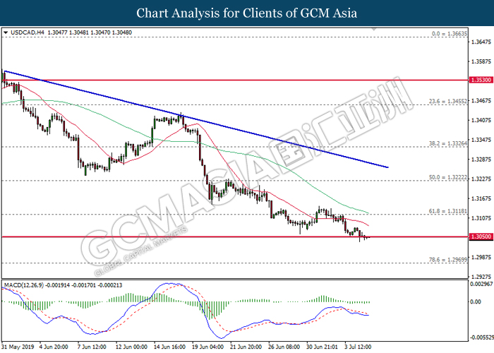 USDCAD, H4: USDCAD was traded lower while currently testing at the support level near 1.3050. MACD which illustrate bearish signal suggests the pair to extend its losses after closing below 1.3050.