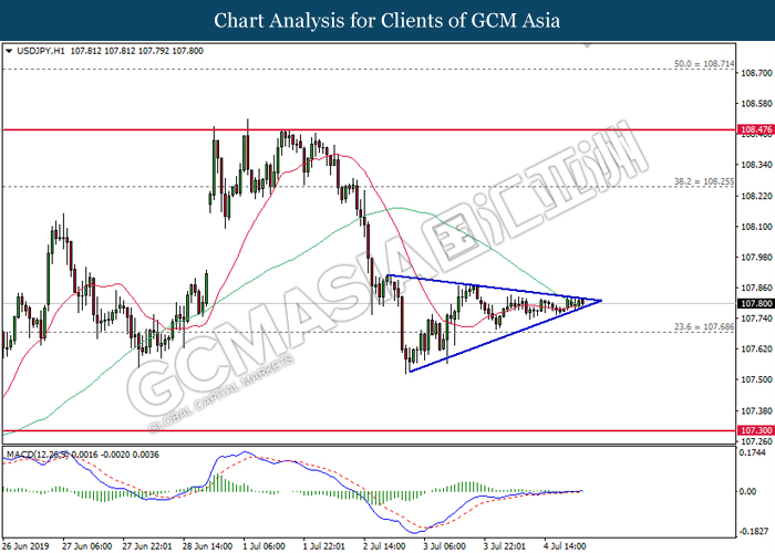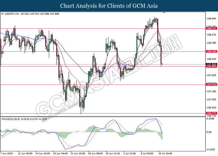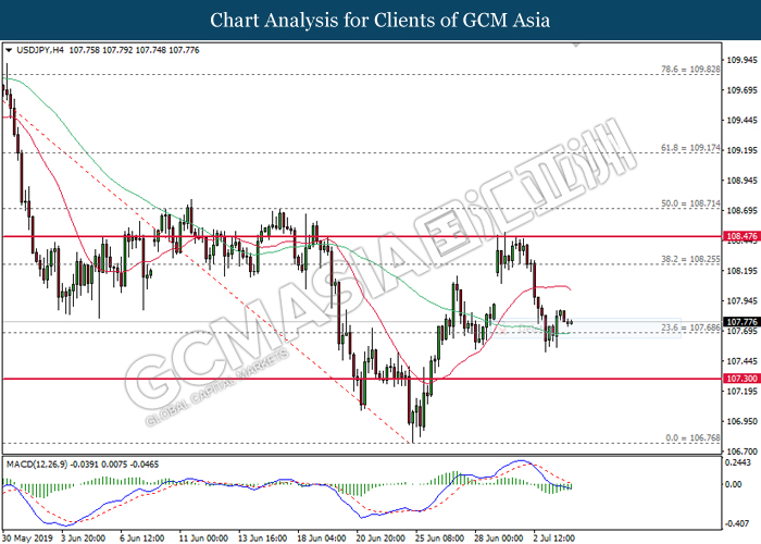 USDJPY, H4: USDJPY was traded lower following prior retracement from its higher levels. MACD which illustrate bearish signal suggests the pair to extend its losses after closing below 107.70.