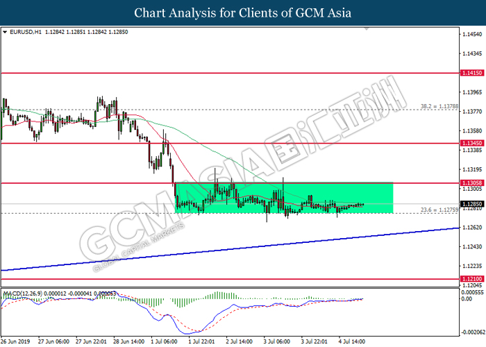EURUSD, H4: EURUSD was traded flat while currently testing the support level. However, MACD which display bullish momentum with the formation of golden cross suggest the pair to rebound towards the resistance level 1.1305.