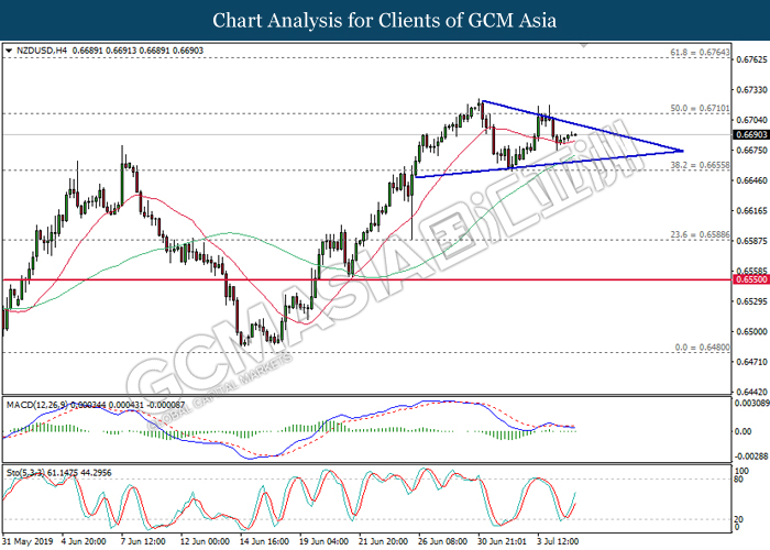 NZDUSD, H4: NZDUSD remains traded within a narrowing triangle formation. Both MACD and Stochastic which illustrate rebound signal suggests the pair to be traded higher in short-term.