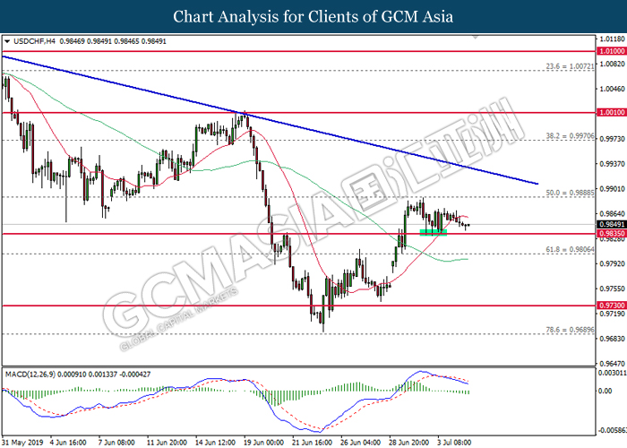 USDCHF, H4: USDCHF was traded lower while currently testing at the support level of 0.9835. MACD which illustrate bearish signal suggests the pair to extend its losses after closing below 0.9835.