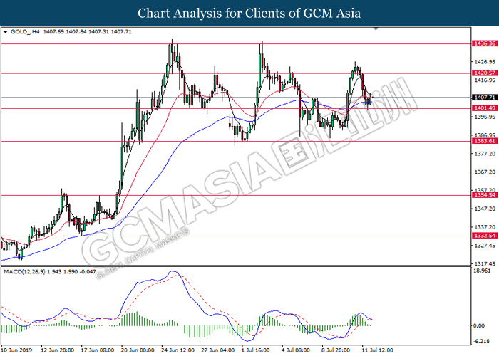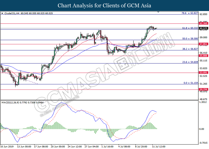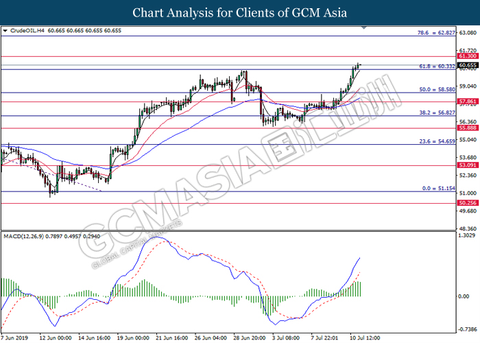 In the commodities market, crude oil price remains steady and edge higher 0.25% to $60.47 per barrel as of writing amid escalating tension between U.S and Iran and potential supply disruption. In recent reports, crude oil sentiment was supported by rumors concerning the US prepares for an air strike over Iranian targets in Syria. At the same time, reports on a tropical storm with “extreme rain” which is forecasted to hit the U.S Gulf coast that could sent oil operation shutting down its production joined further positive sentiment for the oil market. Next, gold price slightly rebound from its losses by 0.25% to $1407.54 a troy ounce at the time of writing after a strong inflation data that beat Fed expectation have previously dragged the safe-haven gold lower.