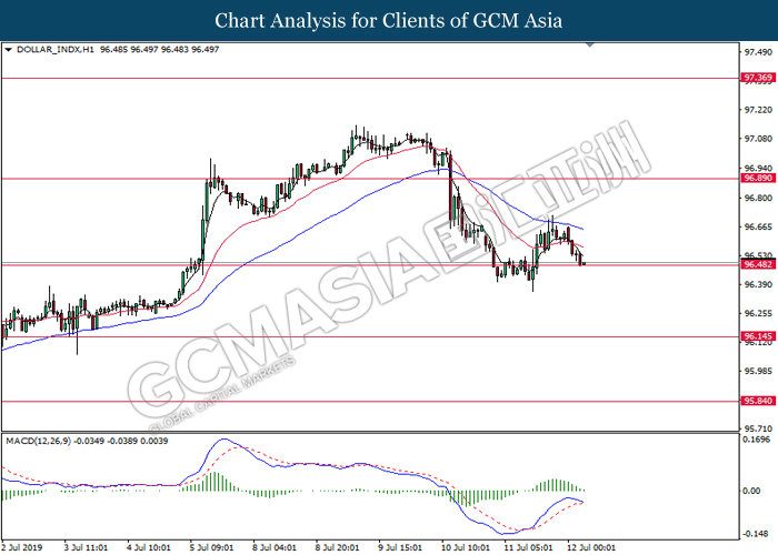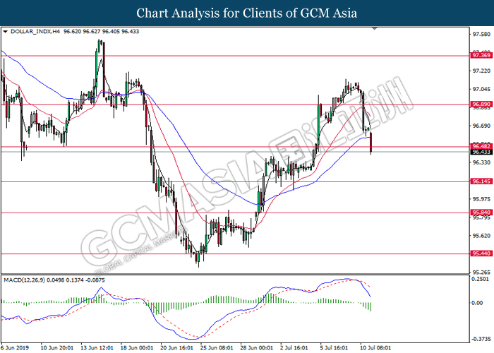 DOLLAR_INDX, H1: Dollar index was traded lower while currently testing the support level 96.50. MACD which illustrate bearish momentum signal suggest the dollar to extend its losses after successfully breakout below the support level 96.50.