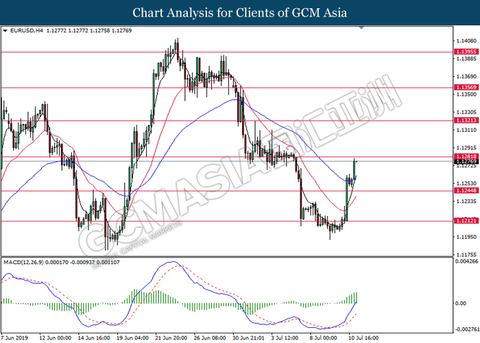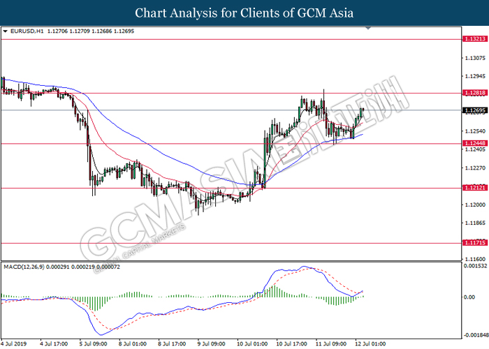 EURUSD, H1: EURUSD was traded higher following prior rebound from the 50 moving average (Blue). MACD which illustrate bullish momentum signal suggest the pair to extend its gains toward the resistance level at 1.1280.