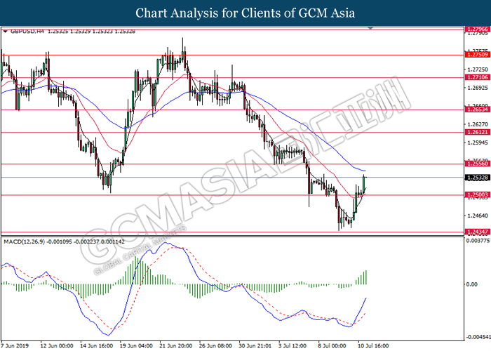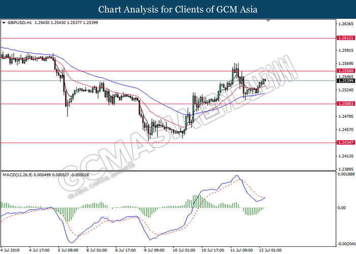 GBPUSD, H1: GBPUSD was traded higher following prior rebound from the 50 moving average line (Blue). MACD which display bullish momentum and the formation of golden cross suggest the pair to extend its gains toward the resistance level at 1.2555.