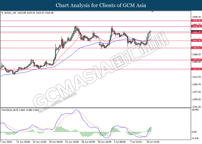 In the commodities market, crude oil price recovered its losses by 0.12% to $56.73 per barrel. Oil prices was traded in a tight range as traders await further signals from the market. On the other hand, gold price rose 0.52% to $1,422.75 a troy ounce as investors currently pricing in a 100% chance for an interest rate cut from the US later this month.