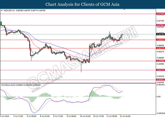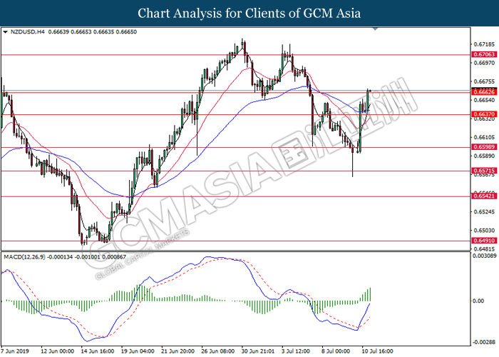 NZDUSD, H4: NZDUSD was traded higher while currently testing at the resistance of 0.6710. MACD which has formed a bullish signal suggests the pair to extend its gains after closing above 0.6710.