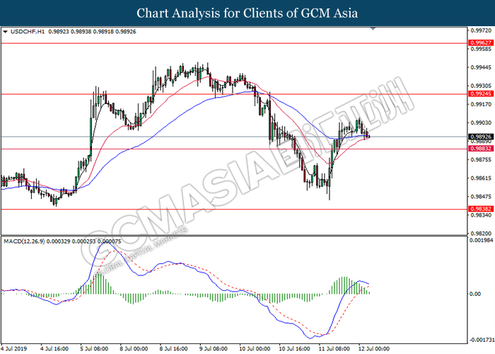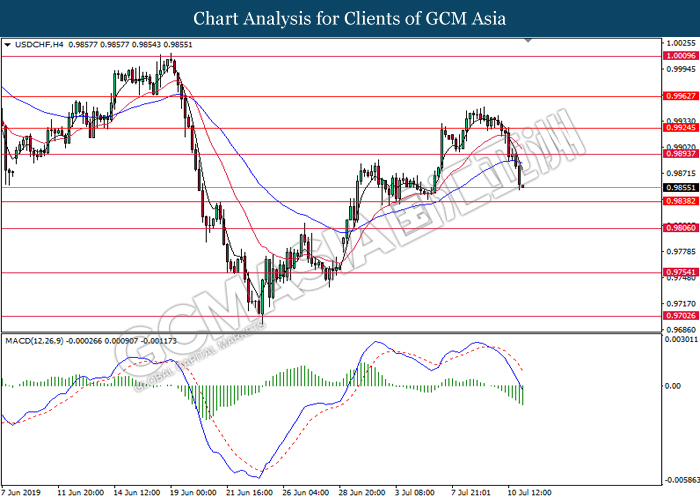 USDCHF, H4: USDCHF was traded lower following prior breakout below the previous support level 0.9855. MACD which illustrate bearish momentum signal suggest the pair to extend its losses towards the support level 0.9800.