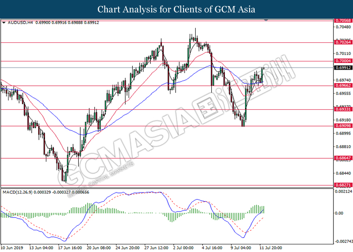 AUDUSD, H4: AUDUSD was traded higher following prior rebound from the support level at 0.6965. MACD which display bullish bias momentum suggest the pair to extend its gains toward the resistance level at 0.7000.