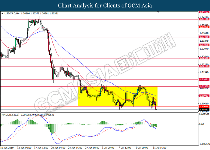 USDCAD, H4: USDCAD was traded lower following prior breakout below the previous channel bottom level at 1.3050. MACD which display bearish bias signal suggest the pair to extend its losses toward the support level at 1.2990.