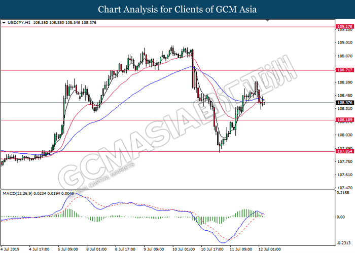 USDJPY, H1: USDJPY was traded lower following prior breakout below the 20 moving average lien (Red). MACD which illustrate diminishing bullish momentum signal suggest the pair to extend its losses toward the support level at 108.20.
