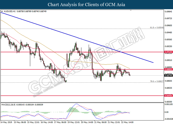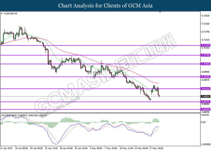 AUDUSD, H1: AUDUSD was traded lower following prior retracement from the resistance of 0.6885. MACD which illustrate diminished upward momentum suggests the pair to be traded lower after closing below the 20-MA line (red).