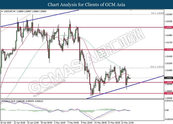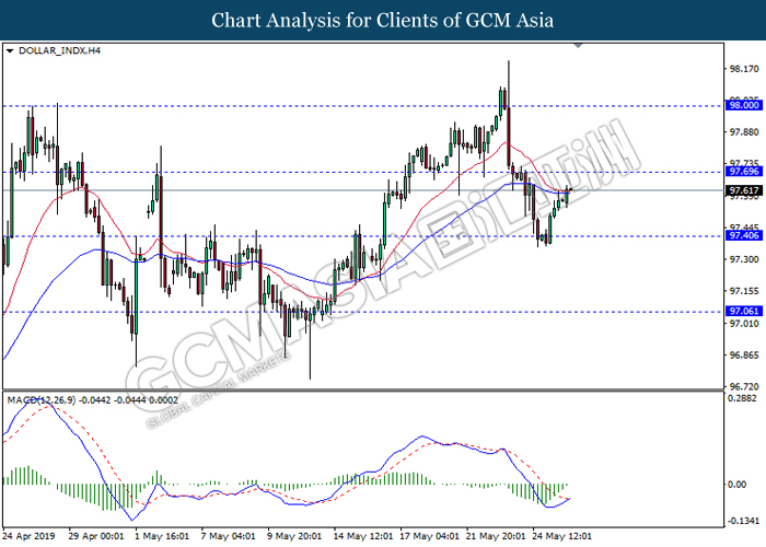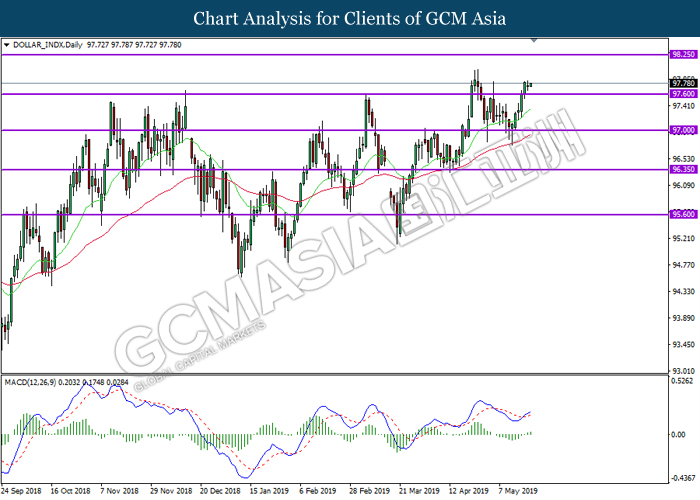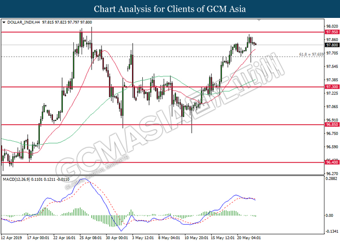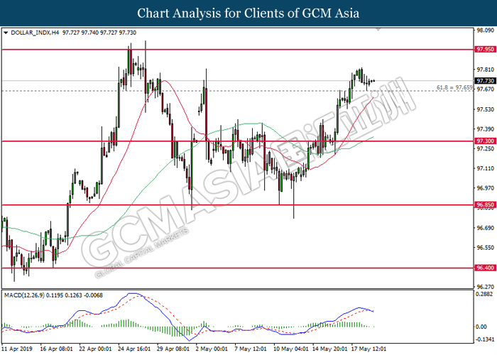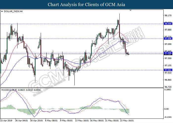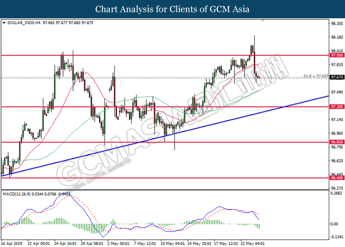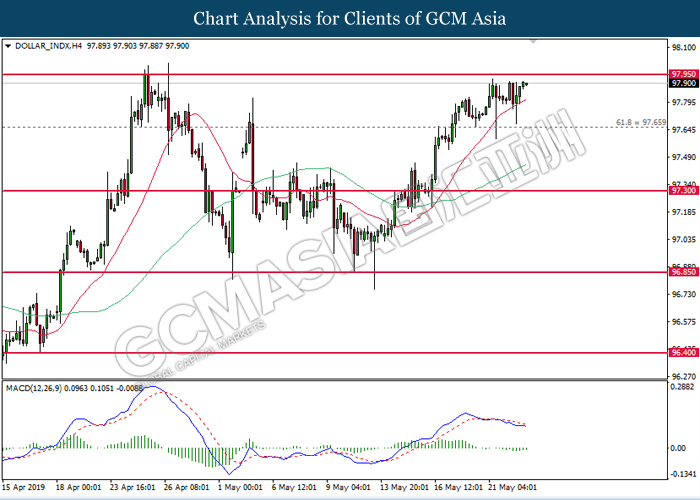 US dollar retraced slightly from its prior high levels following the release of bearish housing data from yesterday. As of writing, the dollar index slipped 0.07% to 97.81 during early Asian trading session. According to US National Association of Realtors, Existing Home Sales for the month of April came in at only 5.19 million units, missing economist forecast for a total of 5.35 million units. The data has undergone depreciation in sales unit for its 14th consecutive months as high prices and tight supply at the lower end of the market continues to sideline potential buyers. However, losses on the greenback were limited after Boston Federal Reserve President Eric Rosengren reiterates that the current policy setting is accommodative and consistent with inflation which may return to the target of 2%. In addition, Rosengren noted current forecasts sees the economy to grow above its potential and current low inflation may be temporary. His comments have dialed down some market concern over the possibility of a rate cut from the Fed by end of this year.
